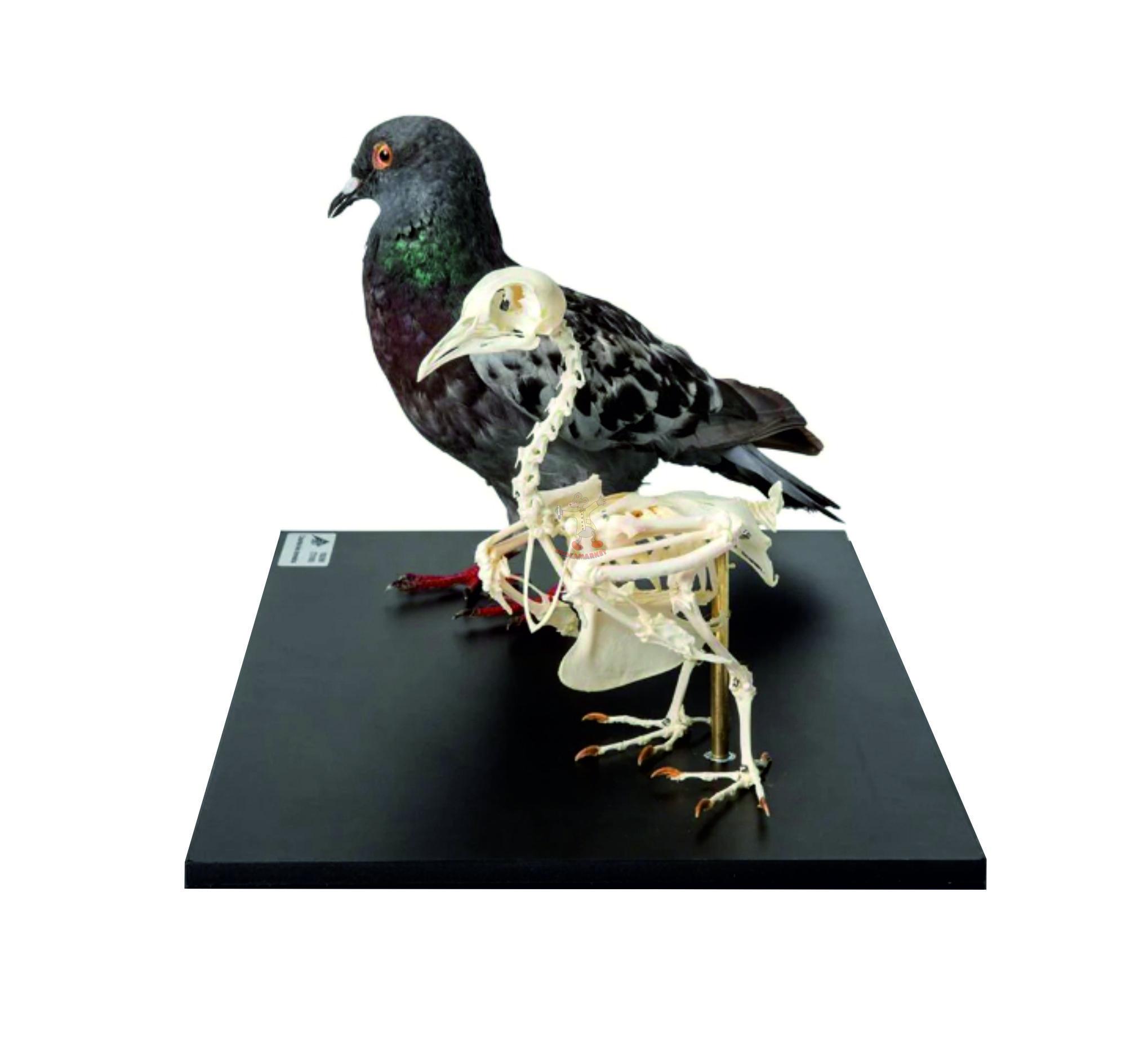 Dermoplastický preparát holuba naaranžovaný v reálném prostředí společně s kostrou. Vhodné pro výuku a pro výstavní účely. Sada je opatřena popiskem a skleněným krytem.