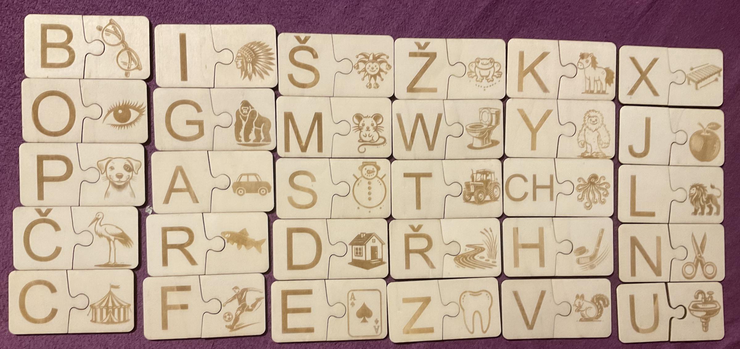 Dřevěná puzzle abeceda. Jedna půlka dílku písmeno, druhá obrázek slova, jenž na toto písmeno začíná.
